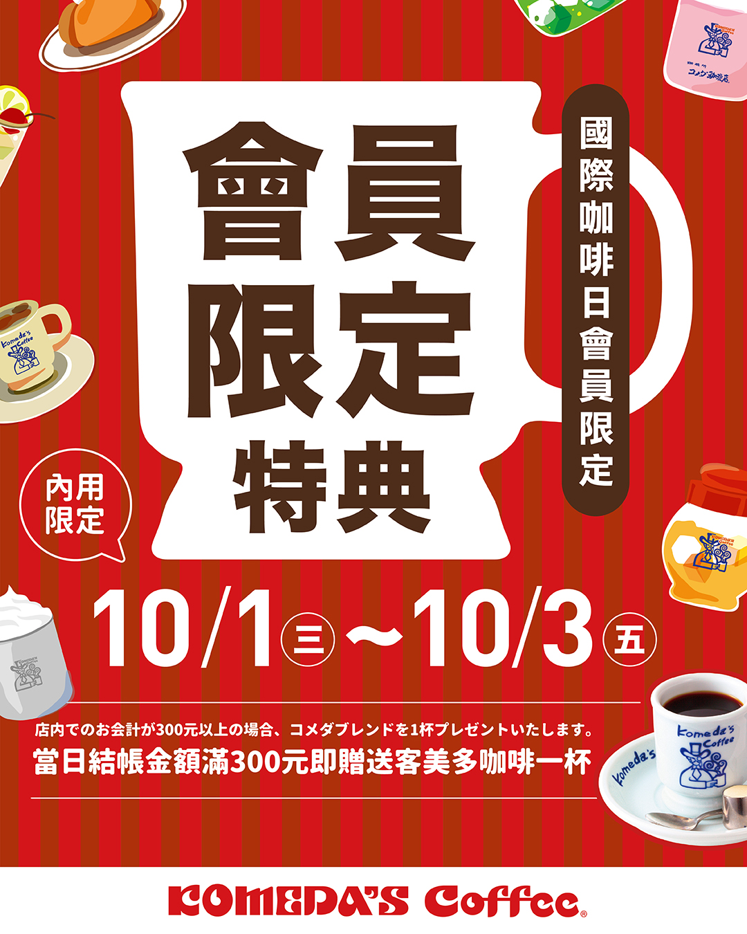 歡慶國際咖啡日,10/1(三)~10/3(五)內用結帳金額滿$300,即贈送客美多咖啡一杯🥳